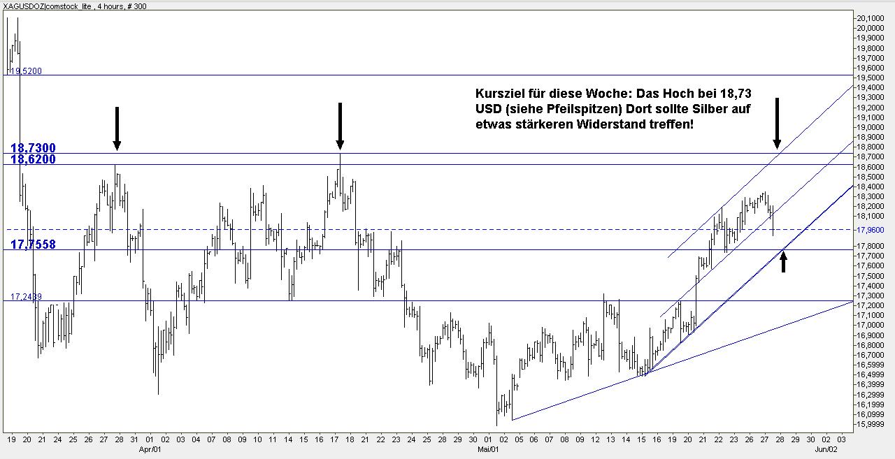 Nachtrag: Falls jemand das Bild nicht öffnen kann. Folgendes habe ich geschrieben: "Kursziel für diese Woche: Das Hoch bei 18,73 USD. Dort sollte Silber auf etwas stärkeren Widerstand treffen!