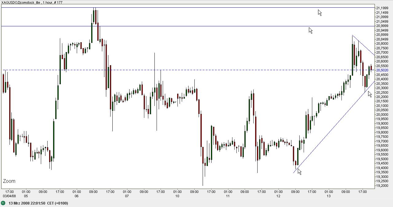 • ALSO: Mein Kursziel für Silber (>21 Dollar) wurde ja leider (noch) nicht erreicht und dass obwohl Gold FAST die 1000 Dollar erreicht hatte (oder doch?). Wie auch immer. Ein starkes Zeichen für Silber wäre es gewesen, die 21 zu erreichen und dann das alte Hoch bei ca. 21,20 zu knacken. Beides wurde nicht erreicht, was aber nicht heissen soll, das es zu einem Sell Off kommt.