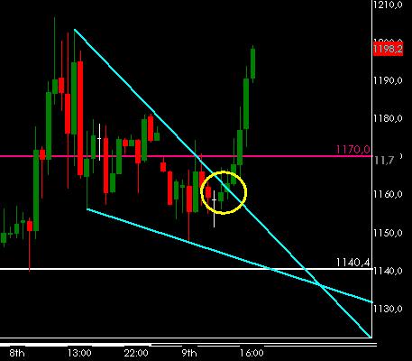 Pusteblume diesen 1Std-Chart hatte ich heute den ganzen Tag vor Augen. Gewartet habe ich auf den Bruch der oberen fallenden hellblauen Trendlinie (siehe gelben Kreis). Denn diese "Keil-Formation" ist eine sehr bullische Ausbruchsformation.