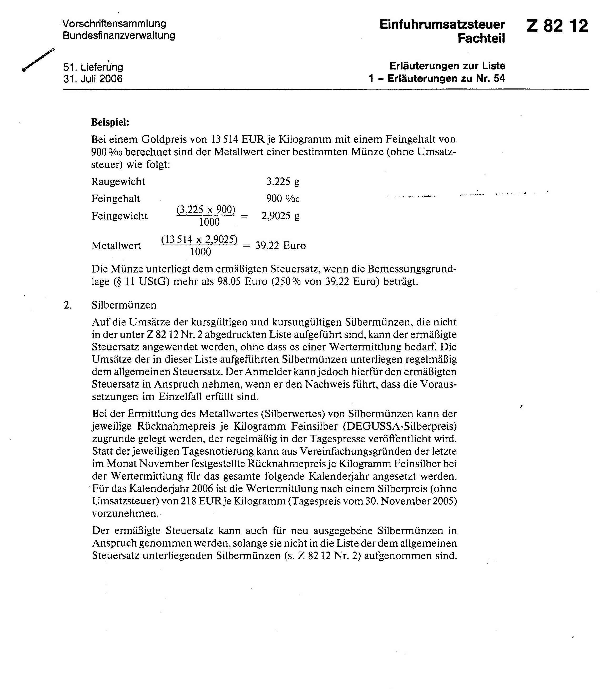 Ich habe vor einiger Zeit mehrere Silbermünzen (Kookaburra, Evolution-Serie) in Australien bestellt. Diese Münzen wurden zollmäßig über den Frankfurter Flughafen abgefertigt und mir über FedEx zugestellt. Der Betrag bezüglich der Einfuhrumsatzsteuer war exorbitat hoch; es dürfte sich hierbei um 19% gehandelt haben. Eine detailierte Rechnung, in dem beispielsweise der Umrechnungskurs ersichtlich ist, wurde mir nicht übergeben. Ich habe dem Boten den Betrag gezahlt um die Ware zu erhalten. Ein Einspruch beim Zollamt in Frankfurt ist diesbezüglich noch anhängig; die Herren baten um Zeit zur Bearbeitung der Sache.