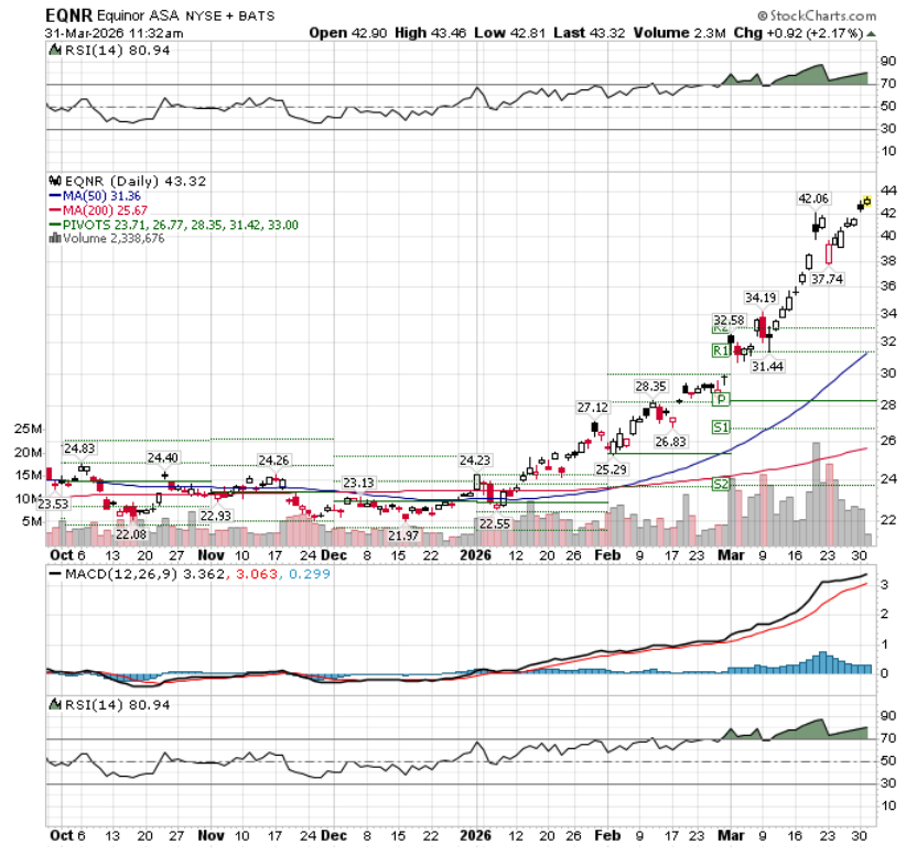 Habe ich als Ölaktie mal herausgepickt, um eine bizarre Kursentwicklung zu zeigen. Kürzlich mit schönem Gewinnm im Dip verkauft, dann bald rückgekauft, läuft die Aktie weiter trotz extrem überkauftem Chart mit extremen Parametern. Der obere Pivot Point ist so hoch überschritten wie selten gsehen....