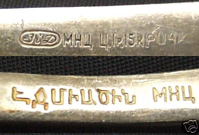 bin neu hier und habe gleich mal eine frage an silberkenner. ich habe ein silberbesteck mit wahrscheinlich russischer punzierung, weiß damit aber nichts anzufangen. ich habe ein bild dazu angehangen. als einzige zahl ist eine 76 zu erkennen. vielleicht kann jemand helfen.