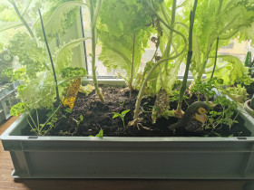 Die Kisten "wandern" übers Jahr durchs Haus und das Vergeilen ist beabsichtigt. Dadurch bekommen die Paprika (Aussaat vor etwa 6 Wochen) etwas mehr Licht und der Salat-Saatgutgewinnung tut es keinen Abbruch. In 2-3 Wochen werden die Samen vom Salat geerntet, die Salatstängel abgeschnitten und die Kiste kommt unter die Lampen. Die Paprika sollten bis dahin etwa 10-15cm hoch gewachsen sein.