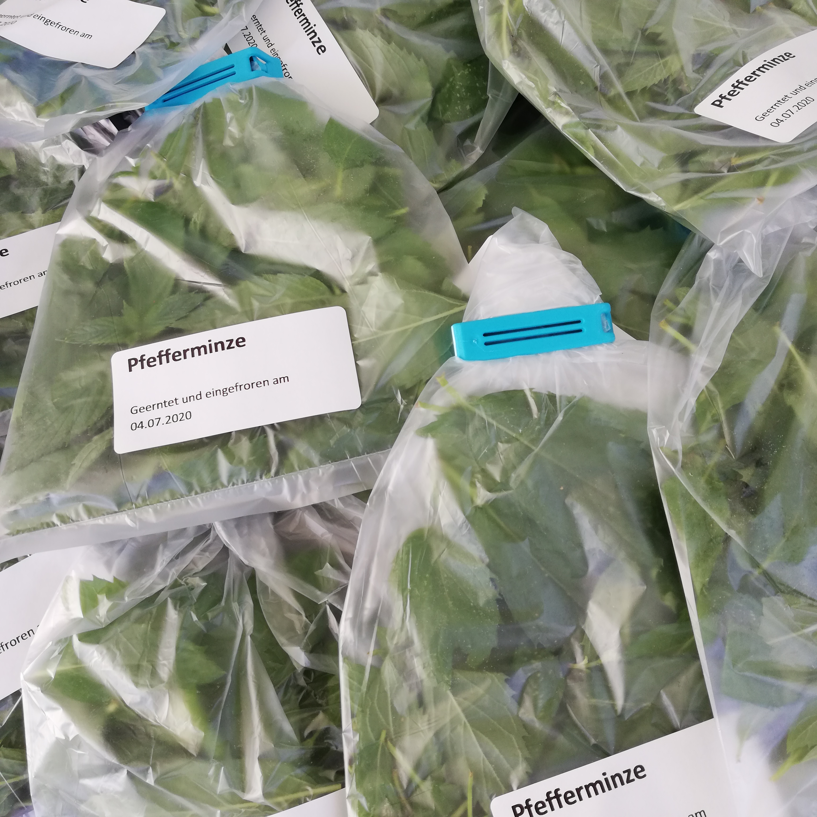 Ich leg die frisch in normale Küchenbeutel, wie hier am Beispiel der heutigen Pfefferminze (ja, ich weiss Lucky, nicht dein Ding :whistling: ). Normalerweise ohne Klammern, hier nur weil es wegen Gartenarbeiten novch ne Stunde geht bis zur Weiterverarbeitung (der Geschmack geht sonst rasant verloren)...