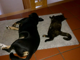 Katze bewacht die Vorräte und Hund kann man zur Not, aber auch nur zur Not, mal auf Wild schicken.