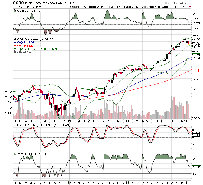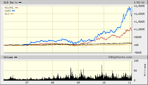 Hier als Beispiel herausgepickt mein mehrjähriges Depotschwerstgewicht Gold Resource / GORO, bin aber "erst" seit dem 16. Nov.2007 dabei , sowie Medusa Mining / MML vs Gold und Silber.