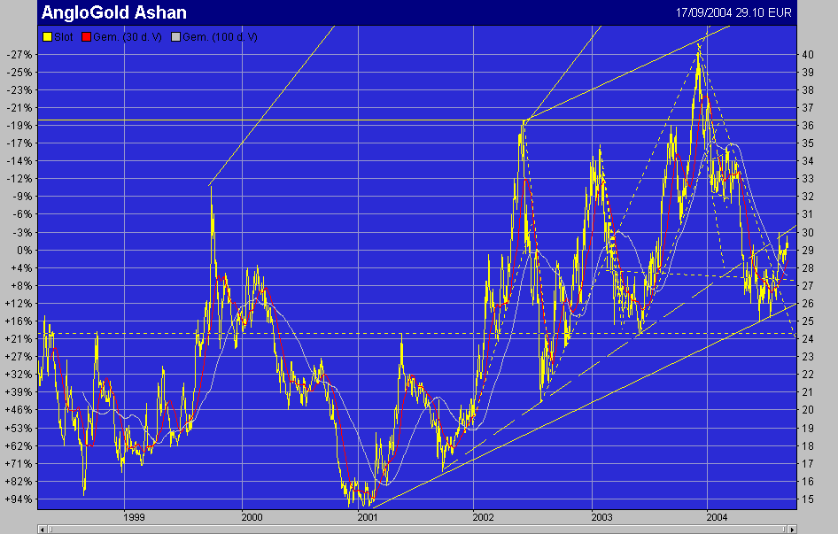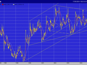 Seit Anfang des Jahrhundert bildet der Goldpreis in USD einen Impuls aus, der 1974 bei Gold 850 USD endete. Seitdem korrigierte Gold in einer komplexen Korrektur als Welle 4 (genau wie der CRB Rohstoff-Index). Details der Welle 4 könnte man diskutieren, entweder sie ist dem dem Low bei Gold 250 USD beendet (gut möglich) oder korriegiert noch weiter (eher unwahrscheinlich).