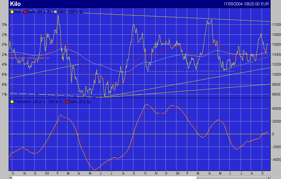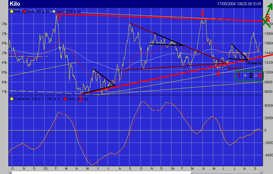 Der Gedanke hinter der 'Gold auf 200 USD These' ist der, dass nach extensierten 5er-Wellen meist eine Korrektur auf die 'nächstkleinere 4' erfolgt, also einen Wellengrad niedriger. Das Problem: War die nächskleinere Welle 5 denn extensiert? Wie man am beigefügten Chart sieht (hoffentlich klappt's mit dem reinstellen), hat sich seit Beginn des Jahrhunderts beim Goldpreis in USD ein normaler Impuls entwickelt, das bedeutet alle Welle (1-3-5) sind in etwa gleichlang. Genau das ist hier in semilog Skalierung der Fall!!!