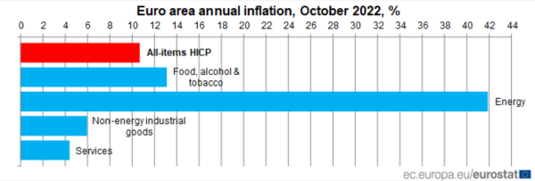 Die Inflation in der Eurozone hat im Oktober einen neuen Rekord erreicht. Eurostat meldete einen Anstieg von 10,7 %. Dies ist ein Anstieg gegenüber den 9,9 % vom September und ein Allzeithoch, seit Eurostat 1997 mit der Erhebung von Daten für die Eurozone begann. Die Europäische Zentralbank (EZB) hat letzte Woche versucht, die Inflation mit einer weiteren Anhebung um 75 Basispunkte einzudämmen. Die EZB weiß, dass die Inflation anhalten wird. Vor kurzem hat sie ihr jährliches Inflationsziel für das nächste Jahr auf 5,8 % geändert, während sie vor drei Monaten noch von 3,6 % ausgegangen war. Sie kann die tatsächlichen Zahlen nicht veröffentlichen, ohne eine Panik auszulösen.