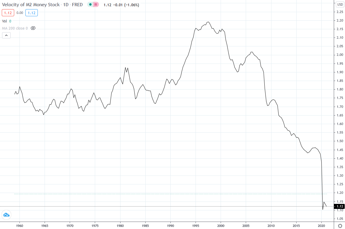 Aus meiner Sicht wird "Velocity of M2" durch ein Ereignis nochmal so weit wie nur irgendwie möglich Richtung 0 fallen. Zugleich wird die Geldausweitung unvorstellbar sein.