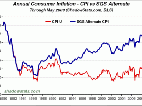 "...Featured is the CPI chart maintained by economist John Williams at Shadowstats.com. His research shows that although price inflation has abated since mid 2008 due to the credit crisis, it is still high at +6%. (Official government statistics show price inflation at -1%, - a number of studies have shown the government statistics to be inaccurate).