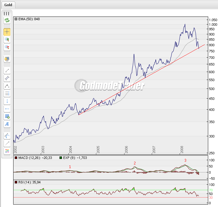Ich habe mir den Silber-Chart angesehen und da erkennt man fast wie aus dem Lehrbuch die 5 Elliott-Wellen - bei Gold jedoch ist alles etwas verschwommen... Wenn man die gleichen Zeitdaten auf Gold überträgt, dann sind einige Punkte im Goldchart auch erkennbar
