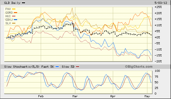 Hier mal der Vergleich HUI als Vertreter der ungehegten Goldminen vs Gold.