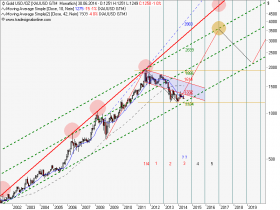 Aus meinem Archiv eine Grafik, in der die letzte große Goldbaisse, sowie die letzte (noch intakte) säkulare Goldhausse -- oder Aufwärtstrend mit starker Korrektur --- auch grafisch definiert werden.