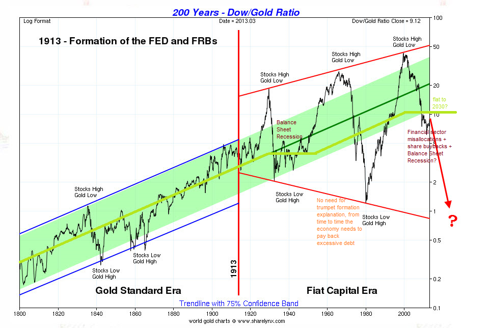 Demnach wäre das faire Dow/Gold Ratio im Jahr 2000 bei 12 gewesen und nicht 18. Und es läge immer noch bei 12 und wird es wahrscheinlich auch bis 2030 bleiben.