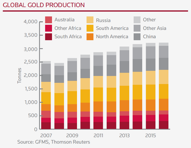 “For instance, examining recent production trends, 1997 to 2007 saw mine production essentially ‘flat-line’ with a compound annual growth rate (CAGR) of 0.04% compared to the gold price which returned a CAGR of 6.5%. Growth finally ‘kicked-in’ and from 2008 to 2016 mine production posted a CAGR of 3.4% compared to a CAGR of 8.7% for the gold price. As noted above, however, we think the latest stage of growth has now run its course. 2016 marks the third consecutive year of falling year-on-year growth rates and we maintain our near term forecast for mine supply to decline in both 2017 and 2018.”