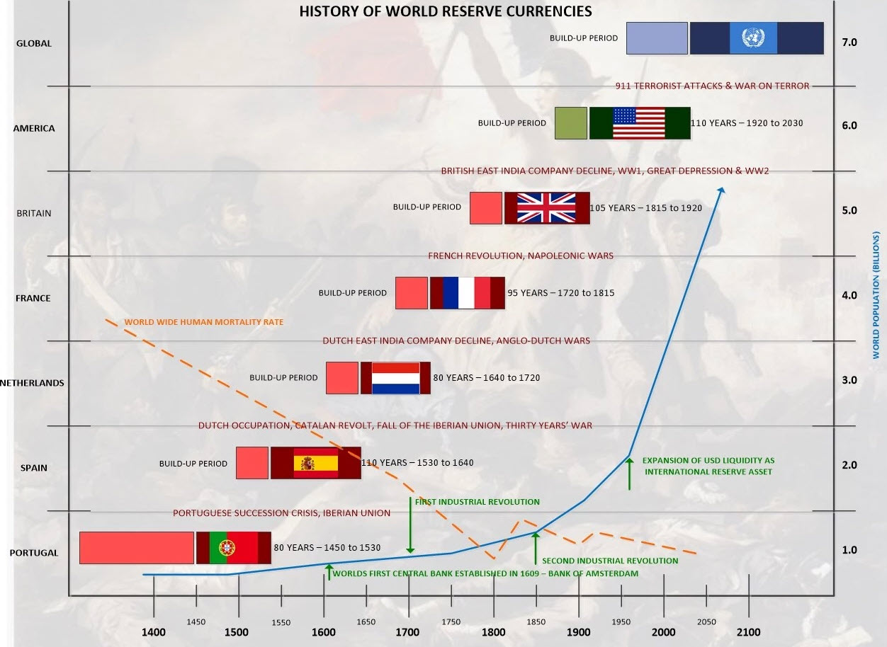 Eine ausdrucksstarke Grafik der Historie der verschiedenen Weltwährungen im Anhang. Der Schlußartikel mit einer Sicht, die so eintreffen könnte: