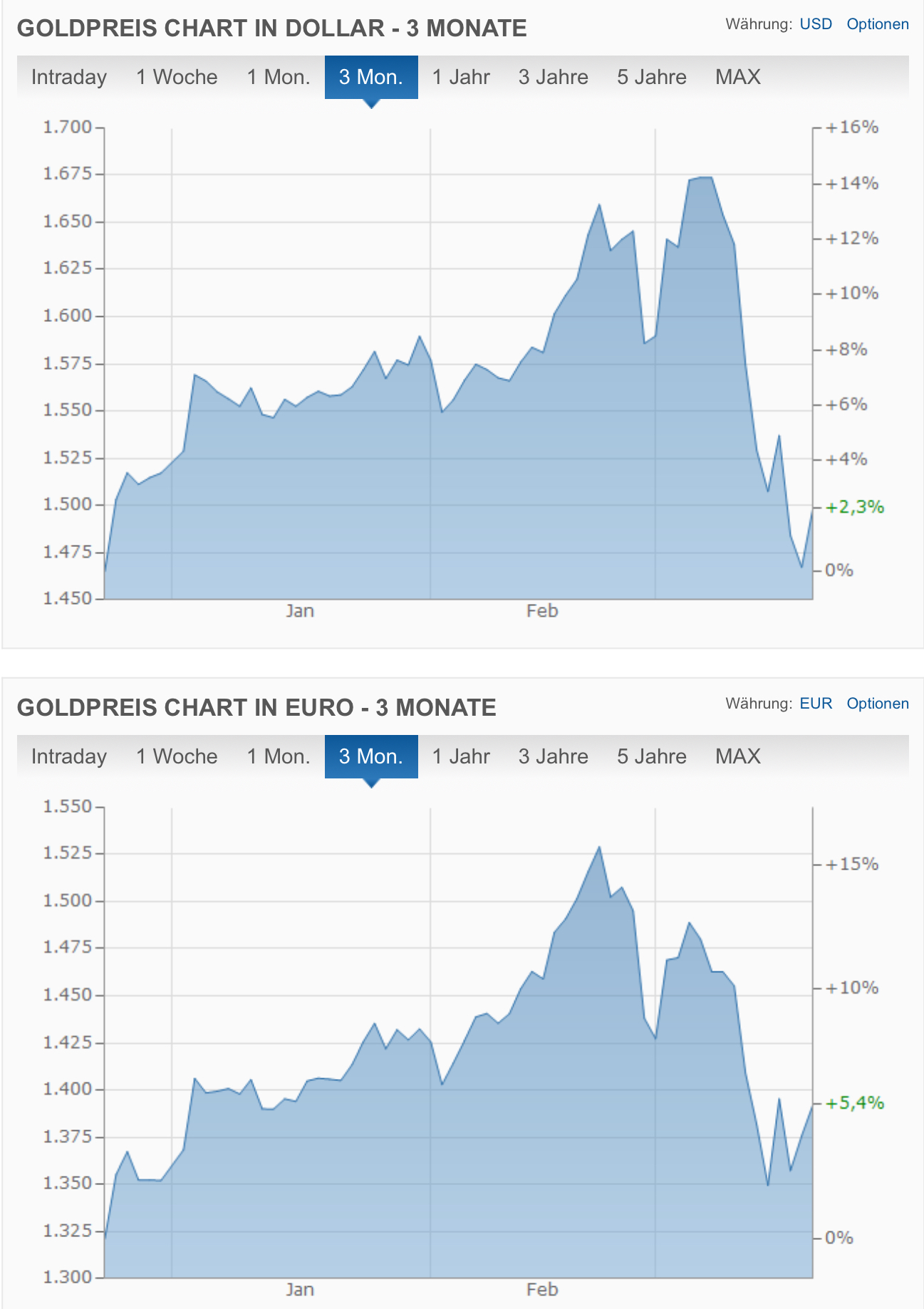 Mich würde nicht wundern, wenn der Preis weiter ansteigt und auch wir Goldbesitzer an den Kosten der Krise beteiligt werden. Nämlich dann, wenn Staaten zur Deckung der Unsummen, Gold verkaufen. Ich meine nicht 100 OZ.