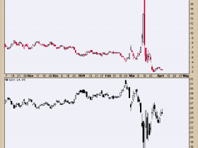 Noch ein Chart, der schon bizarr aussieht: Der GDX für Goldminen in vereinfachter Darstellung und der DUST, ein 3 fach gehebelter Put auf den GDX.