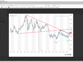 Erst Ausbruch aus dem Dreieck nach Unten, nun Doppelboden in Grün und mit der blauen Flagge rauf zum Retest des Dreicks. Gehts da durch, wandert der Doller wieder gen 1.60 zum Euro und davon gehe ich eh aus.