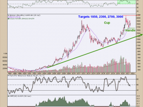 Über die Kursziele läßt sich streiten, aber bei der Ausformung sind 2900 $ drin. Das Pikante dabei ist, daß solche Charts keine Zeitvorgabe haben, auch weiß niemand, welchen Wert der $ vs Gold hat oder vice versa...