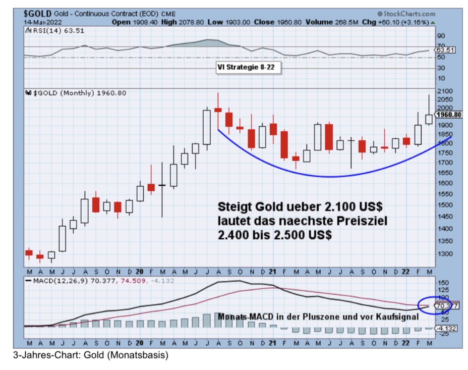 Gold stieg in der Vorwoche in Richtung seines Rekordhochs und verpasste dies lediglich um rund 5 US$. Die nachfolgende Korrektur ist sozusagen eine perfekte Reaktion des Marktes: Kein Fehlausbruch, sondern Gewinnmitnahmen standen zunächst im Vordergrund. Damit ist der Goldmarkt bereinigt. Folgt ein neuer Rekord, eröffnet sich auf charttechnischer Basis ein Preisziel in Richtung 2.400 bis 2.500 US$.