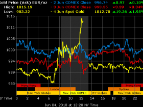 Der gestrige Eurogoldrekord grafisch dem Goldpreis gegenübergestellt in $, ausgelöst durch den schnellen Preiseinbruch des €.