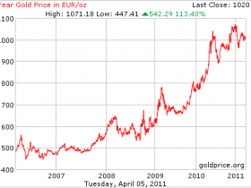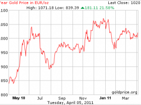 Obwohl eigentlich alle Fundamentaldaten dagegen sprechen, gehe ich weiterhin davon aus, dass der Goldpreis gemessen in Euro weiterhin leicht fallend bis negativ ist, so wie in den vergangenen (fast) 12 Monaten. (Euro heute neuer Jahresrekord 1,435)