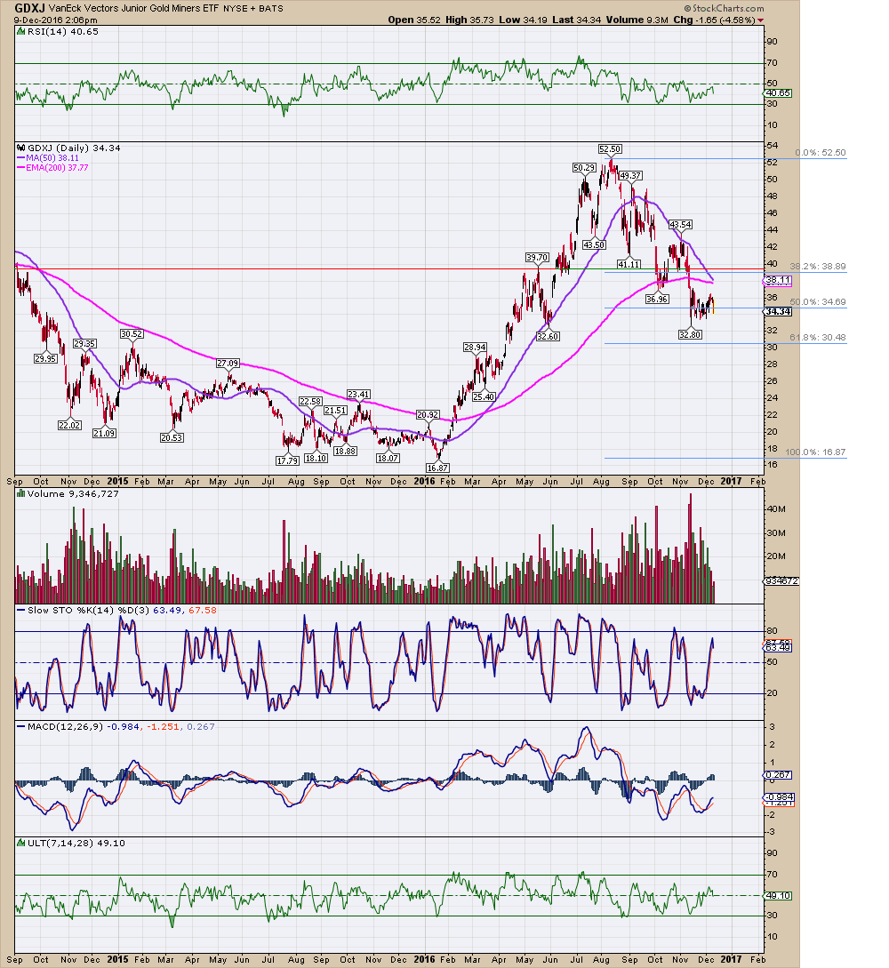 „The technicals argue that both Gold and gold mining stocks could drop a tiny bit more before starting a rebound. It would not surprise me if the sector is soft into or even immediately after the coming Federal Reserve rate hike. Once that passes, the sector could be in position to rally as expected...“