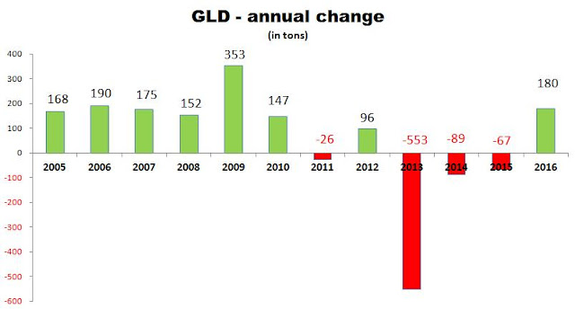 Zu diesem Thema 2 weitere Charts. Der erste zeigt schön die Bestandsveränderungen des GLD ETF in 2016. Trotz erheblicher Abflüsse in der 2.Jahreshälfte mit sehr positiver Bilanz.