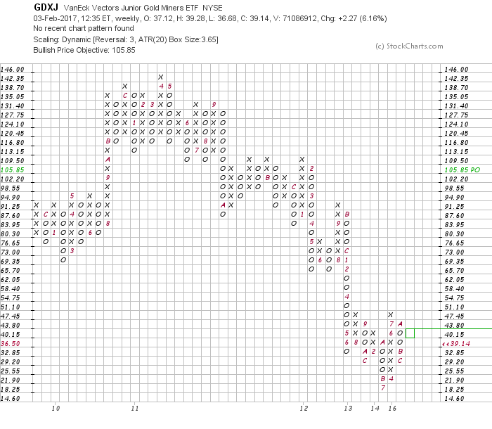 Zum Wochenende und für Minenfreunde 2 optimistische P&F Charts des GDXJ und GDX.