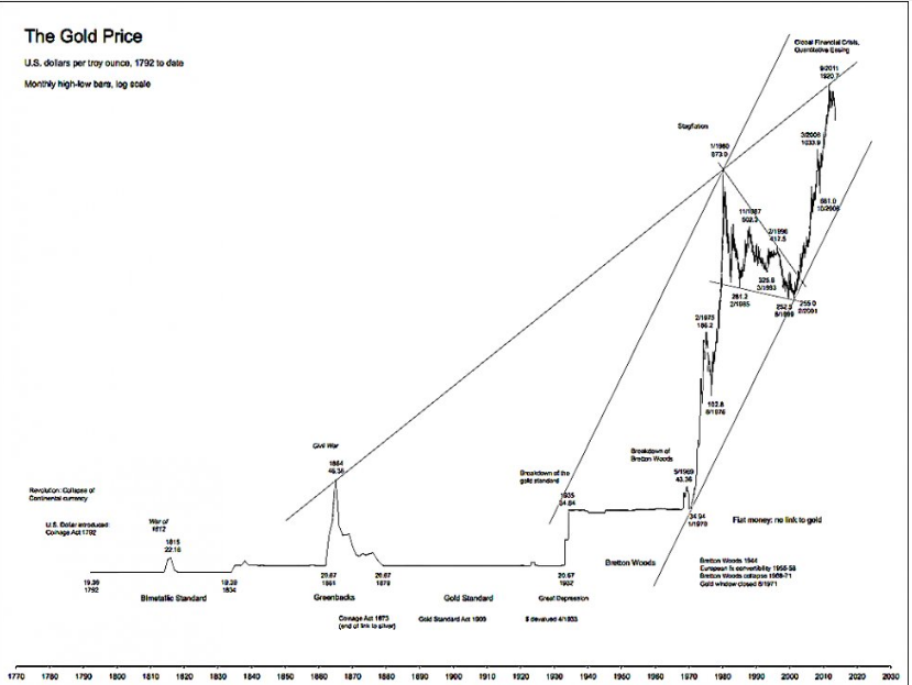 Ergänzend zum Tagesrauschen, dem täglichen und kurzfristigen Auf und Ab mal ein sehr langfristiger Goldchart.