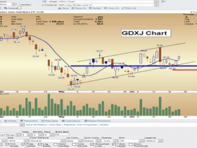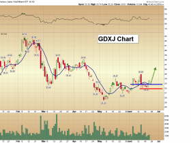Der GDXJ zweimal im Chart. Beachtenswert die wellenförmige Kursentwicklung mit kleiner werdenden Ausschlägen... Trendkanal, ansteigend....