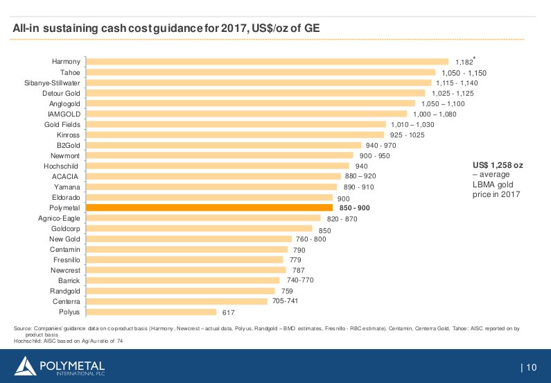 Hier nun eine umfangreichere Tabelle mit den AISC, entnommen aus der Präsentation der Polymetal International / POLY vom Februar 2018. Es sind dies Kosten einschl. der Nebenmetalle, also Goldäqivalent / GE.