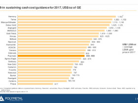 Hier nun eine umfangreichere Tabelle mit den AISC, entnommen aus der Präsentation der Polymetal International / POLY vom Februar 2018. Es sind dies Kosten einschl. der Nebenmetalle, also Goldäqivalent / GE.