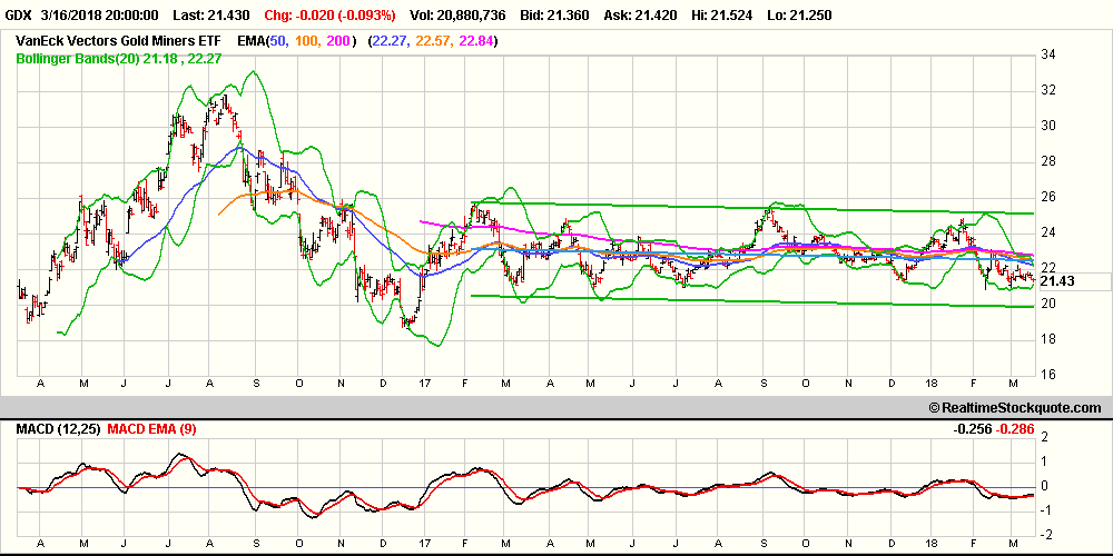 Den Seitwärtskanal der Minen wollte ich schon früher bringen: Jeder, der ein Depot mit PM Aktien hat, merkt das merkwürdige auf und ab im Seitwärtsschritt, hier abgebildet im GDX über 1 Jahr.