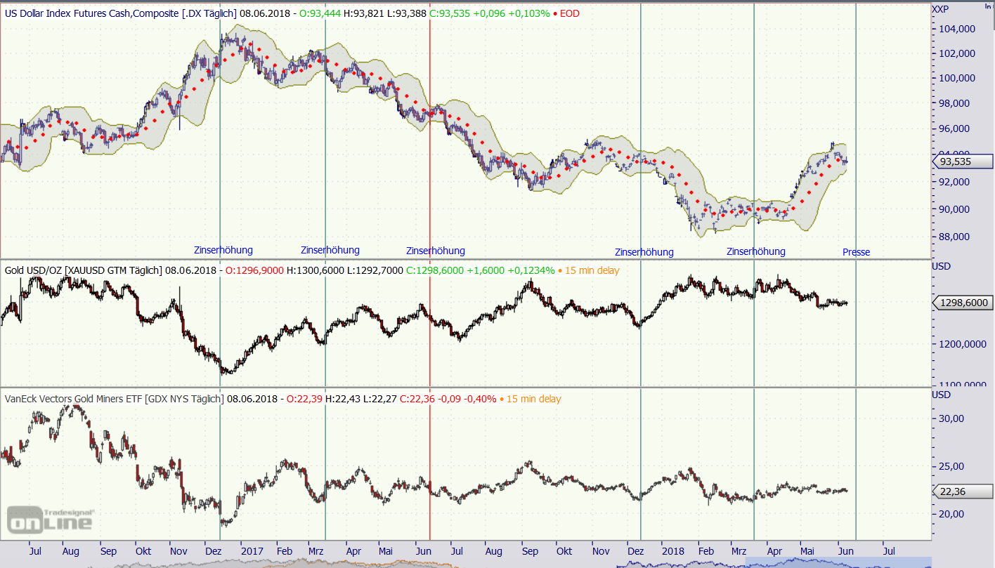 Nur im Juni 2017 hat Gold auf die Zinserhöhung negativ reagiert. Sonst war die Reaktion positiv.