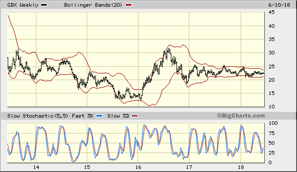 "Meanwhile, the GDX has now reached the lowest ever weekly Bollinger bandwidth in its history, which is setting up a large move very soon. The major miner ETF has continued to trade in a very tight range, which is a sign of an accumulation of energy that will be released once the market presents a catalyst for a move in either direction. The committee results of the FOMC meeting next Wednesday could easily provide such a catalyst."