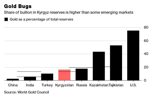"..At least that’s what Kyrgyzstan’s central bank is doing in a bid to protect itself from currency volatility in China and Russia. The central Asian nation hopes to grow the share of gold in its $2 billion international reserves to 50 percent from around 16 percent now....