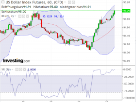 Im Stundenchart liegt das untere Bollingerband bei 1220. Der USD Index steigt wieder in Richtung 95.