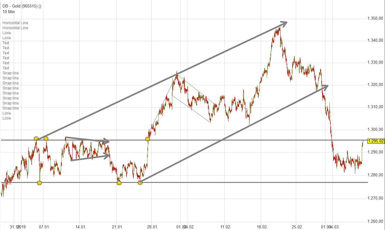 Nach dem Durchbruch durch die untere Begrenzung des kurzfristigen Aufwärtstrendkanals hatte der POG praktisch eine ganze Woche lang mit nur geringen Ausschlägen exakt um die Mitte des horizontalen Konsolidierungsfensters vom Jahresanfang gependelt, ohne den oberen oder unteren Begrenzungen nahe zu kommen.