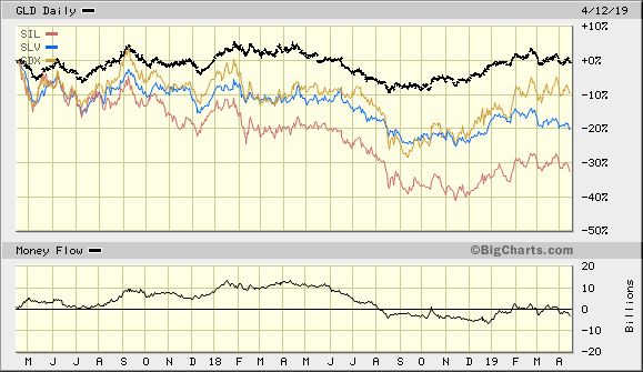 Ein Vergleich Gold : Goldminen und Silber : Silberminen, vereinfacht GLD: GDX und SLV : SIL über 2 Jahre sowie 1 Jahr zeigt die Korrelation der Minenwerte mit ihren Hebeln vs die Edelmetalle.