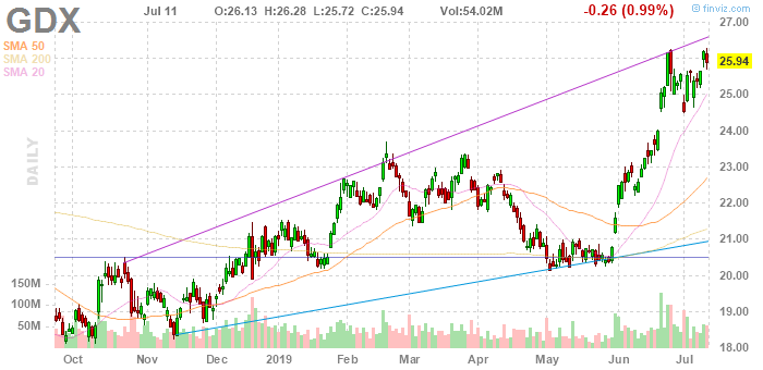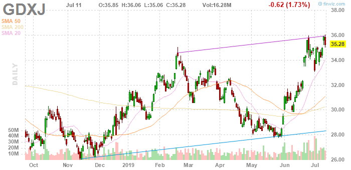 Die freundliche Entwicklung des Goldpreises wirkte sich auch auf die Goldminen aus. Vorgestern erzielten der GDXJ für Gold Explorer und der GDX als breiterer Minenindex 3 bzw. 2 Jahreshochs. Der Goldpreis erreichte vor wenigen Tagen 6 Jahres Hochs, wie auch hier berichtet.