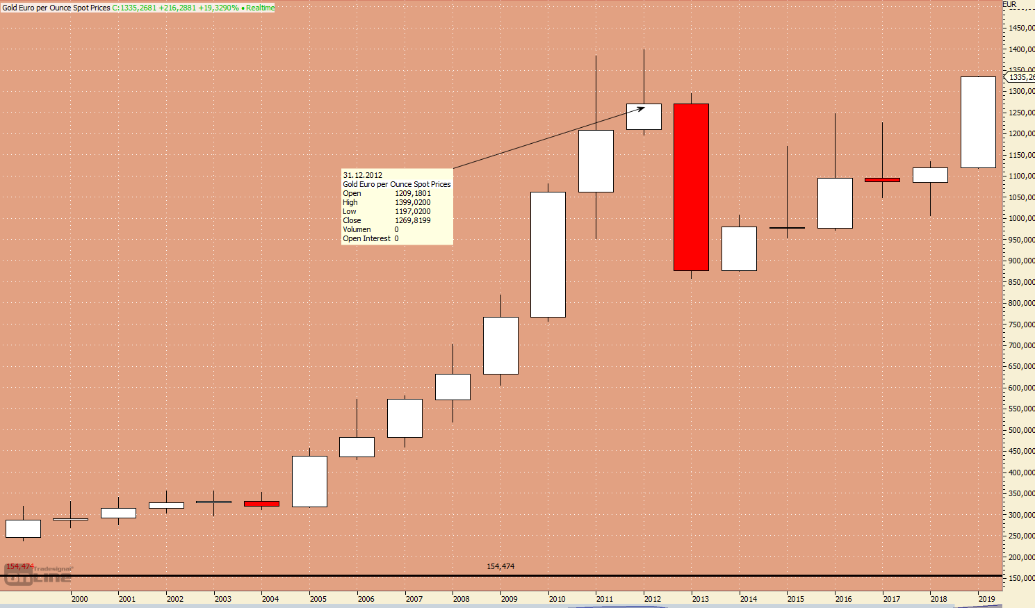 Für den Stand von 2012 müsste sich der Goldpreis je nach Referenzpunkt mindestens mal verdoppeln vom derzeitigen Niveau aus.