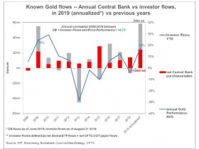 Daß die Zentralbanken das 4 Jahr in Folge Gold in zunehmendem Umfang kaufen, ist bekannt und gut, aber die enorme Zunahme der Investitionskäufe in 2019 bereits ist doch beeindruckend.
