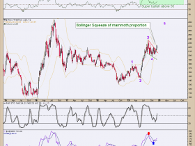 Stellvertretend für Goldminen dieser 5 J Chart mit einigen sehenswerten Merkmalen : Ein bullischer fallender Keil UND ein stark verengendes Bollingerband.
