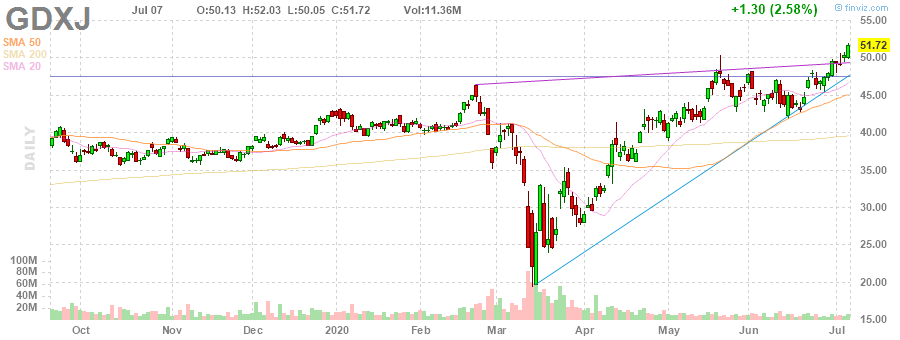 Bei dem GDXJ ist der Ausbruch erfolgt, sh.Chart. Einige Explorer und Entwickler nahmen dies bereits einige Tage vorweg und stiegen tw. um ein Mehrfaches seit dem Coronatief...