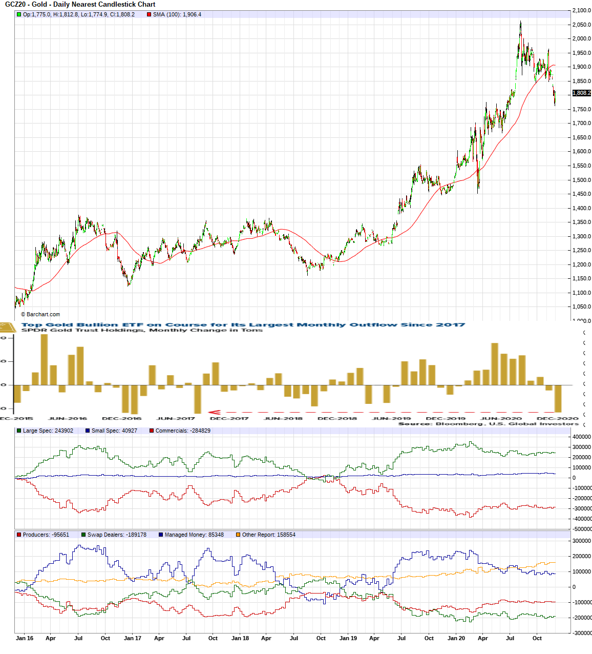 "Der größte goldbesicherte ETF, der SPDR Gold Trust, steuert auf seinen größten monatlichen Abfluss seit 2017 zu. Der ETF hat im November bereits über 50 Tonnen Goldbarren verloren. Gold steuert auf einen vierten monatlichen Rückgang in Folge zu, und die ETFs sind auf den ersten Monat der Abflüsse in diesem Jahr eingestellt, nachdem die Bestände im Oktober einen Rekord erreicht hatten...."