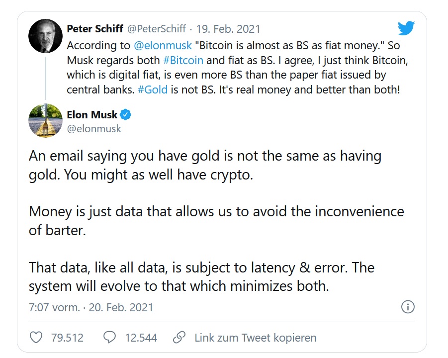 • Übrigens: Ich lese diesen Schlagabtausch zwischen Musk und Schiff als bullish für (physisches!) Gold.