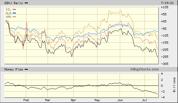 Ein Vergleich YTD zigt die Marktschwäche vs dem XAU, der größere Minen vertritt, sowie Gold und den Silberminenindex SIL.